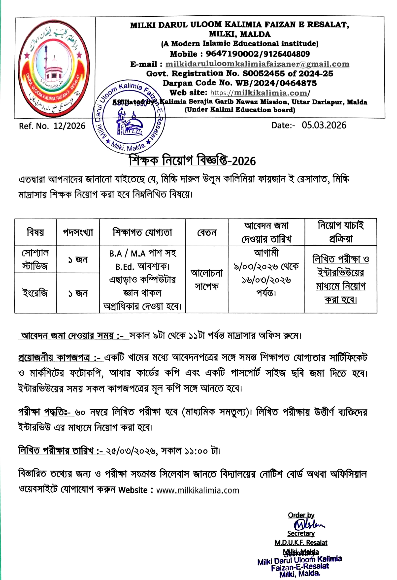 Milki Darul Uloom Kalimia Faizan E Resalat is a modern Islamic educational institute, widely regarded as one of the most respected madrasah in the Indian subcontinent. Established in 1990, Founded by Hazrat Syed Masrur Ahmed Kalimi Chisti-Ul-Qadri, Miranpur Katra, Dist- Shahjahanpur, State- Uttar Pradesh (U.P), India. At present his son Peer-e-Tarikat Syed Masud Ahmed Kalimi Chisti-Ul-Qadri, Miranpur Katra, Dist- Shahjahanpur, State- Uttar Pradesh (U.P), India, is the Chief Advisor of the Society (Milki Darul Uloom Kalimia Faizan E Rasalat). It stands proudly in the heart of Milki, within the Malda District of West Bengal, India.