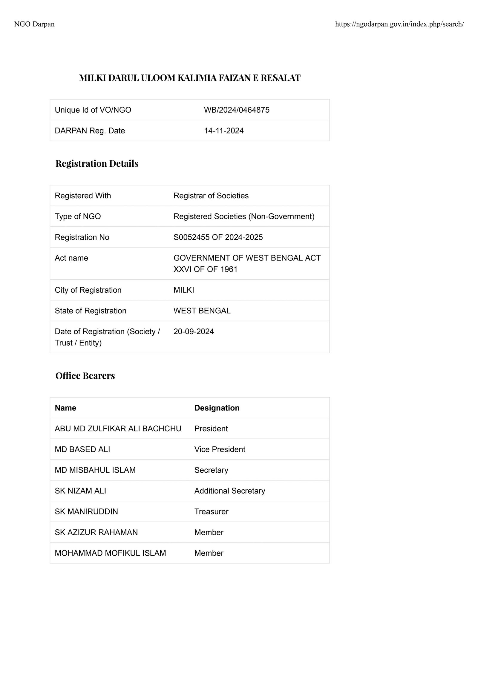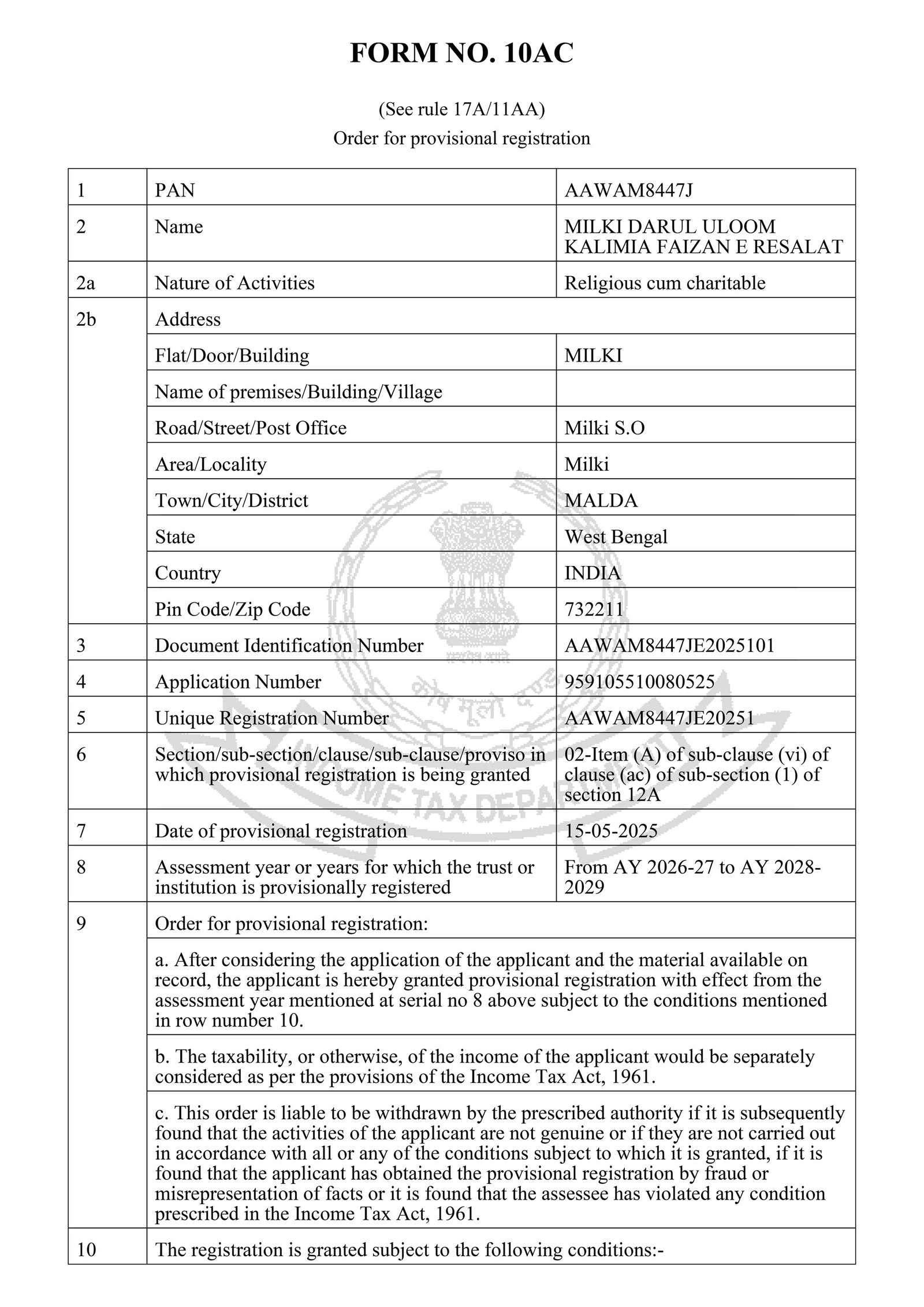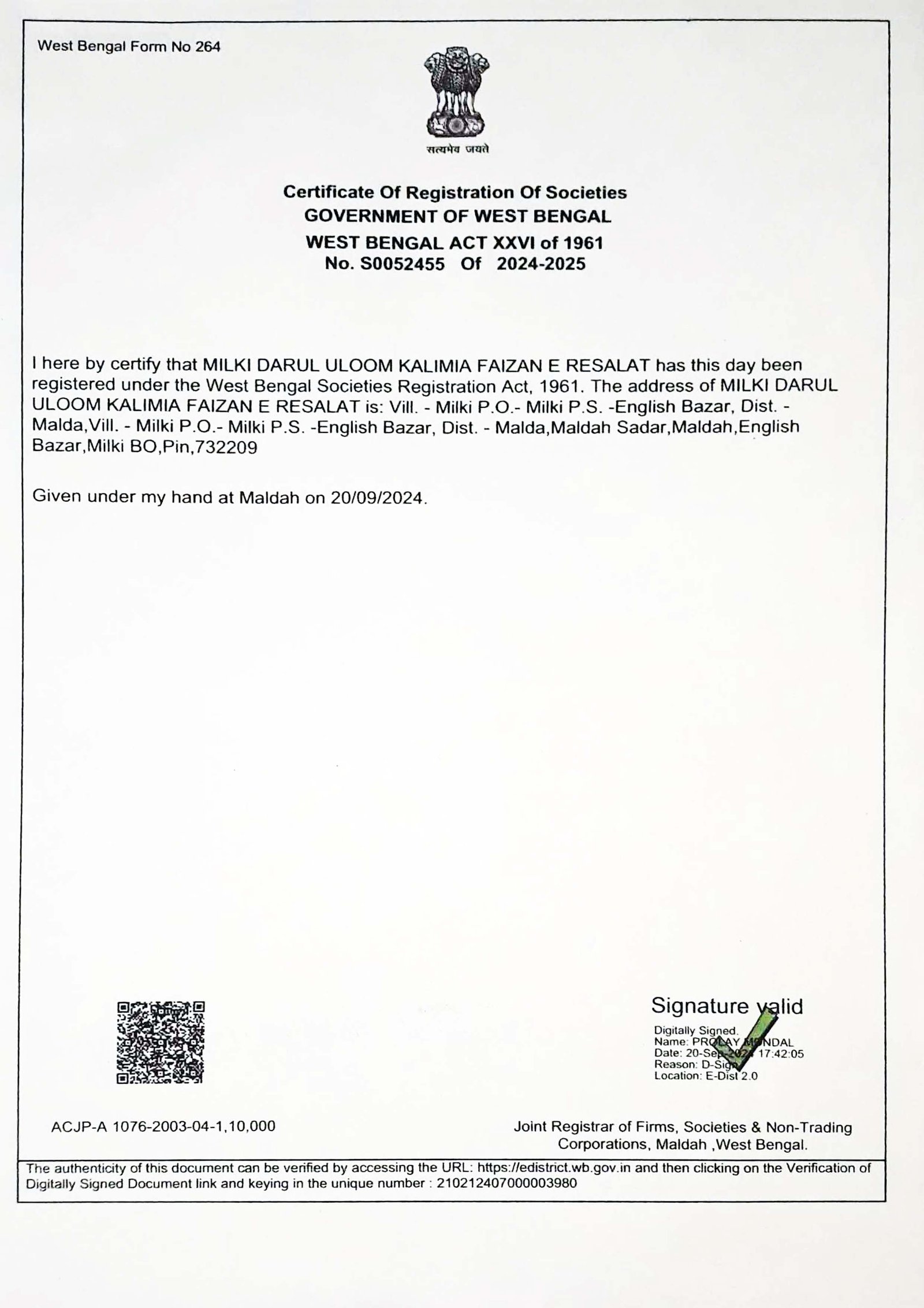 Milki Darul Uloom Kalimia Faizan E Resalat is a modern Islamic educational institute, widely regarded as one of the most respected madrasah in the Indian subcontinent. Established in 1990, Founded by Hazrat Syed Masrur Ahmed Kalimi Chisti-Ul-Qadri, Miranpur Katra, Dist- Shahjahanpur, State- Uttar Pradesh (U.P), India. At present his son Peer-e-Tarikat Syed Masud Ahmed Kalimi Chisti-Ul-Qadri, Miranpur Katra, Dist- Shahjahanpur, State- Uttar Pradesh (U.P), India, is the Chief Advisor of the Society (Milki Darul Uloom Kalimia Faizan E Rasalat). It stands proudly in the heart of Milki, within the Malda District of West Bengal, India. The madrasah campus spreads across a peaceful 0.4 acres approx area, providing an ideal environment for learning, reflection, and moral development.